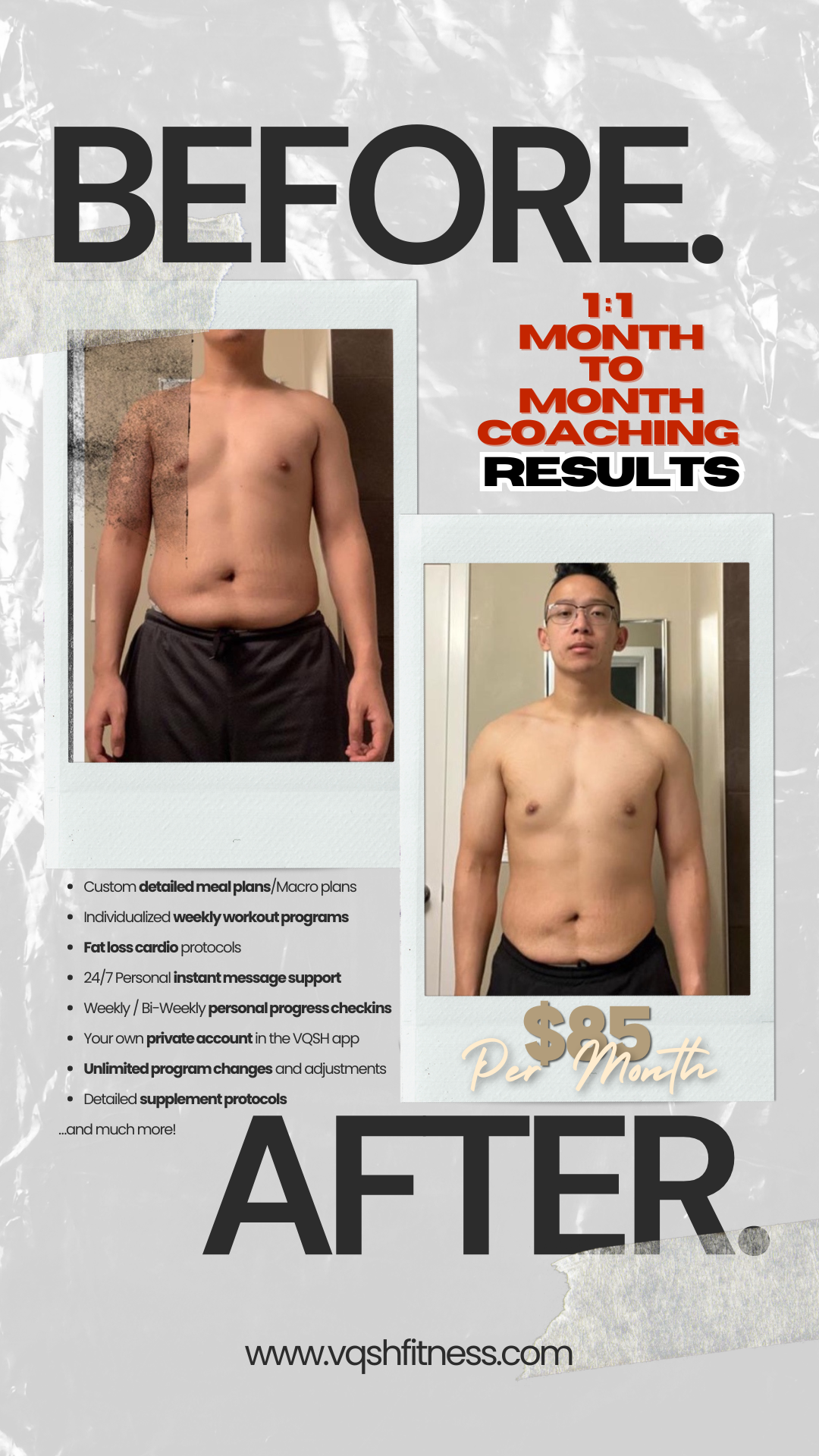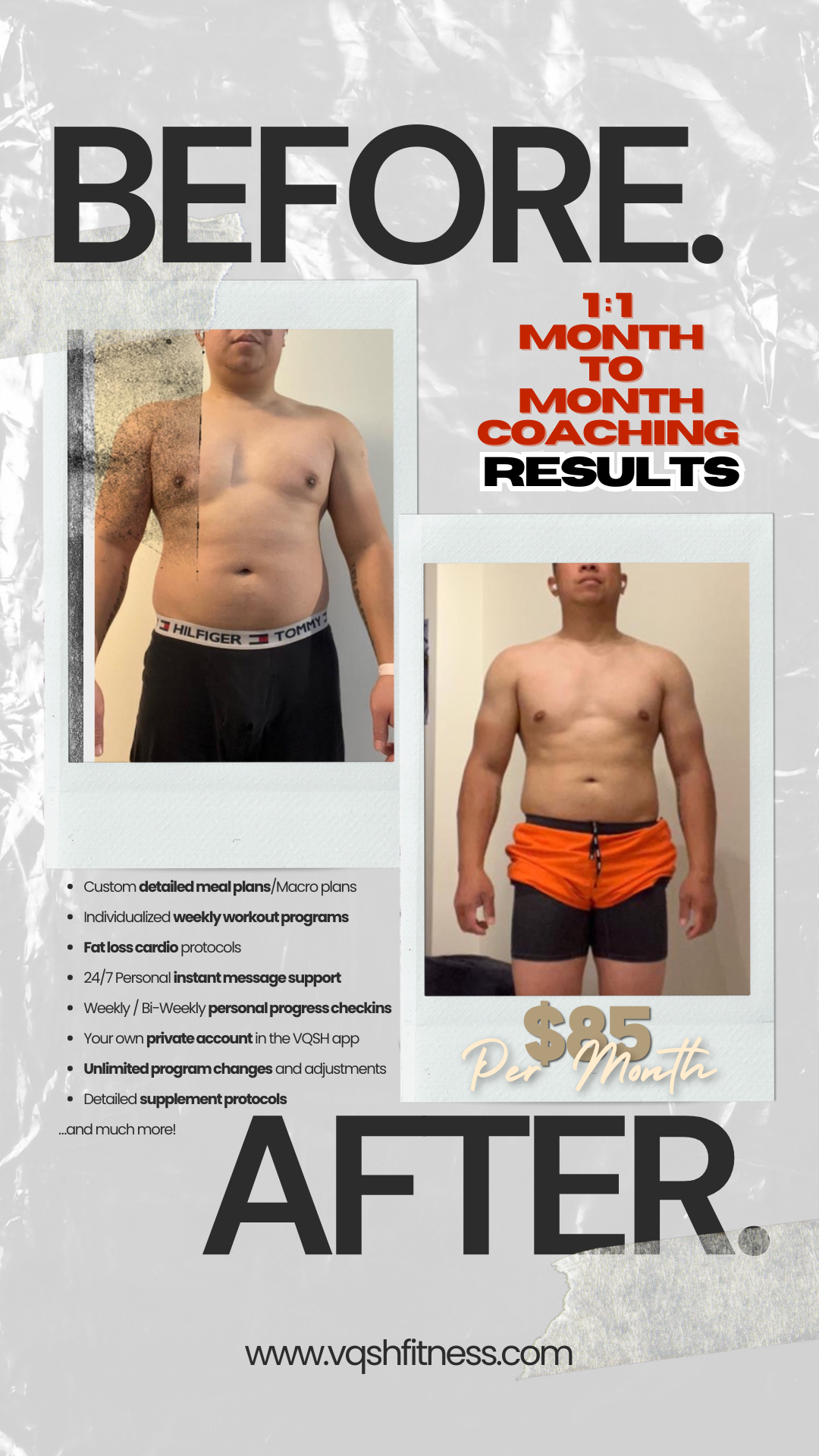 Are you tired of feeling lost in the gym or struggling with complicated diets? Do you believe that fitness coaching is beyond your budget, or that getting in shape means living on chicken and rice? It's time to rewrite the story of your fitness journey with VQSH Fitness, where we believe that health and wellness should be accessible, effective, and empowering for everyone.
